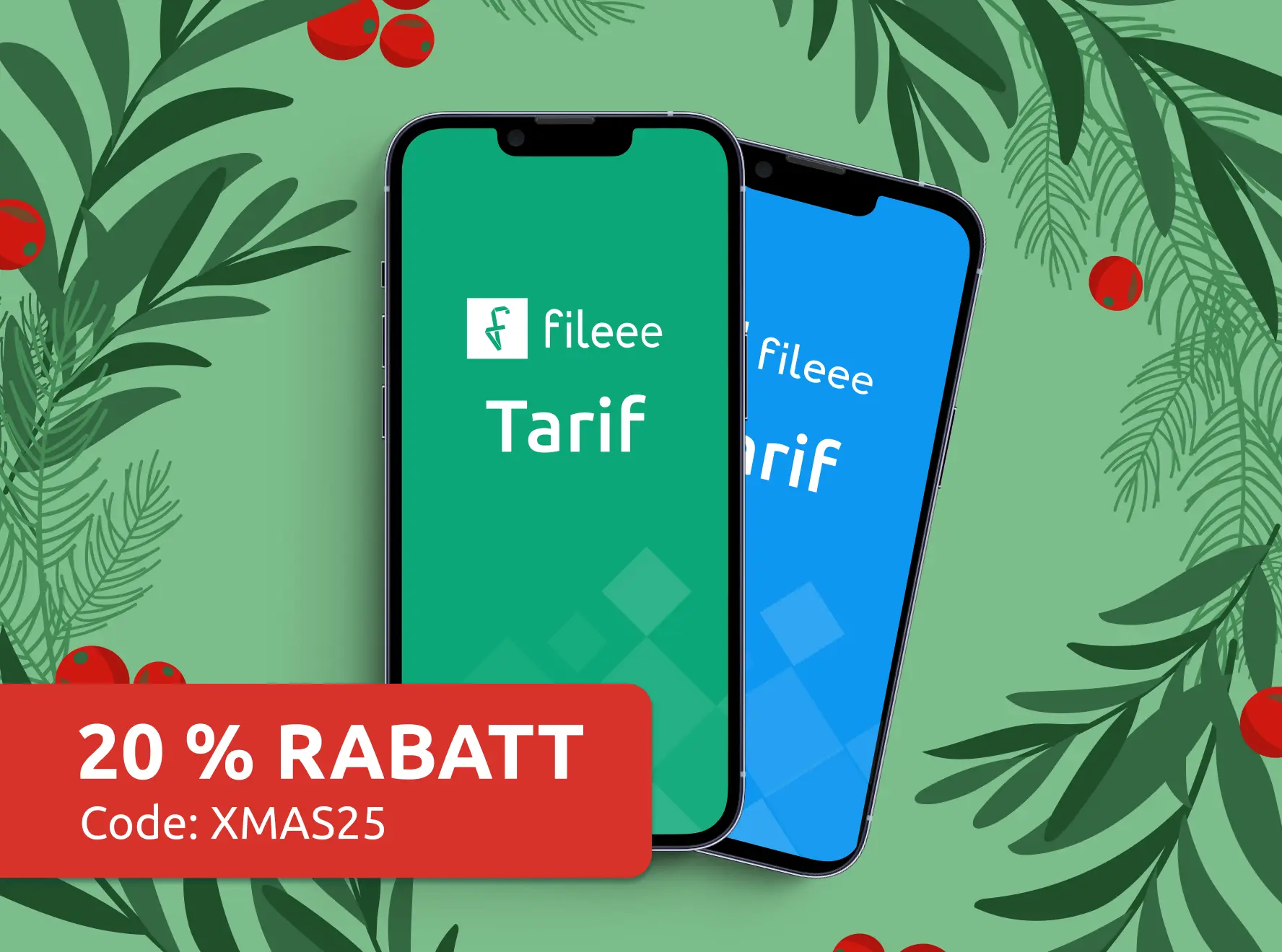 Erhalte 20 % auf unser Starter-Paket, bestehend aus einem Jahrestarif und einer fileeeBox - und wir schenken Dir das fileeeDIY! Einfach alle drei Produkte in Deinen Warenkorb legen und mit Coupon-Code XMAS25 sparen.
